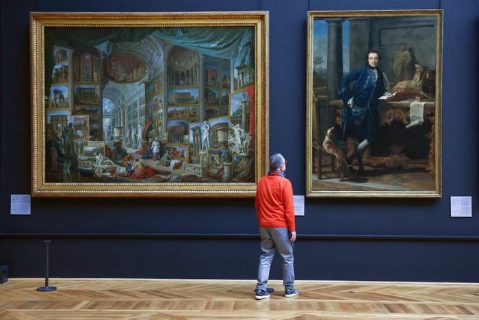 12月2日,在法国巴黎卢浮宫博物馆,一名男子在德农馆翻新后的展厅欣赏画作。德农馆为卢浮宫博物馆三大主展馆之一。图据新华社/路透