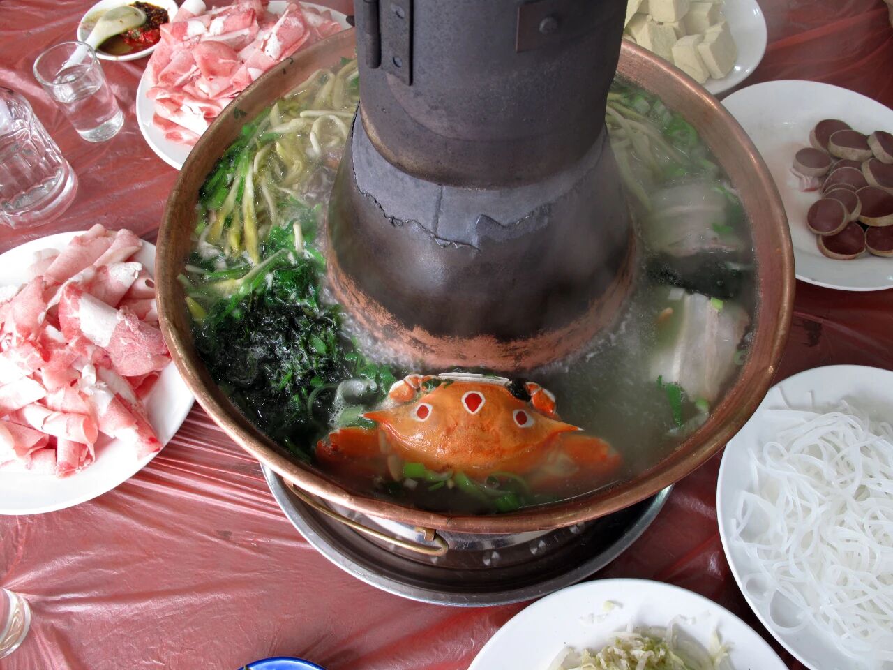 它是一种满族传统火锅,锅是北方常见的铜火锅,锅底是用老母鸡、猪骨等熬成的清汤。涮菜里的东北酸菜是灵魂,其他菜品以猪肉、血肠、冻豆腐为主,黄花菜也是特色。在乌拉街,就可以品尝到最正宗的乌拉火锅。